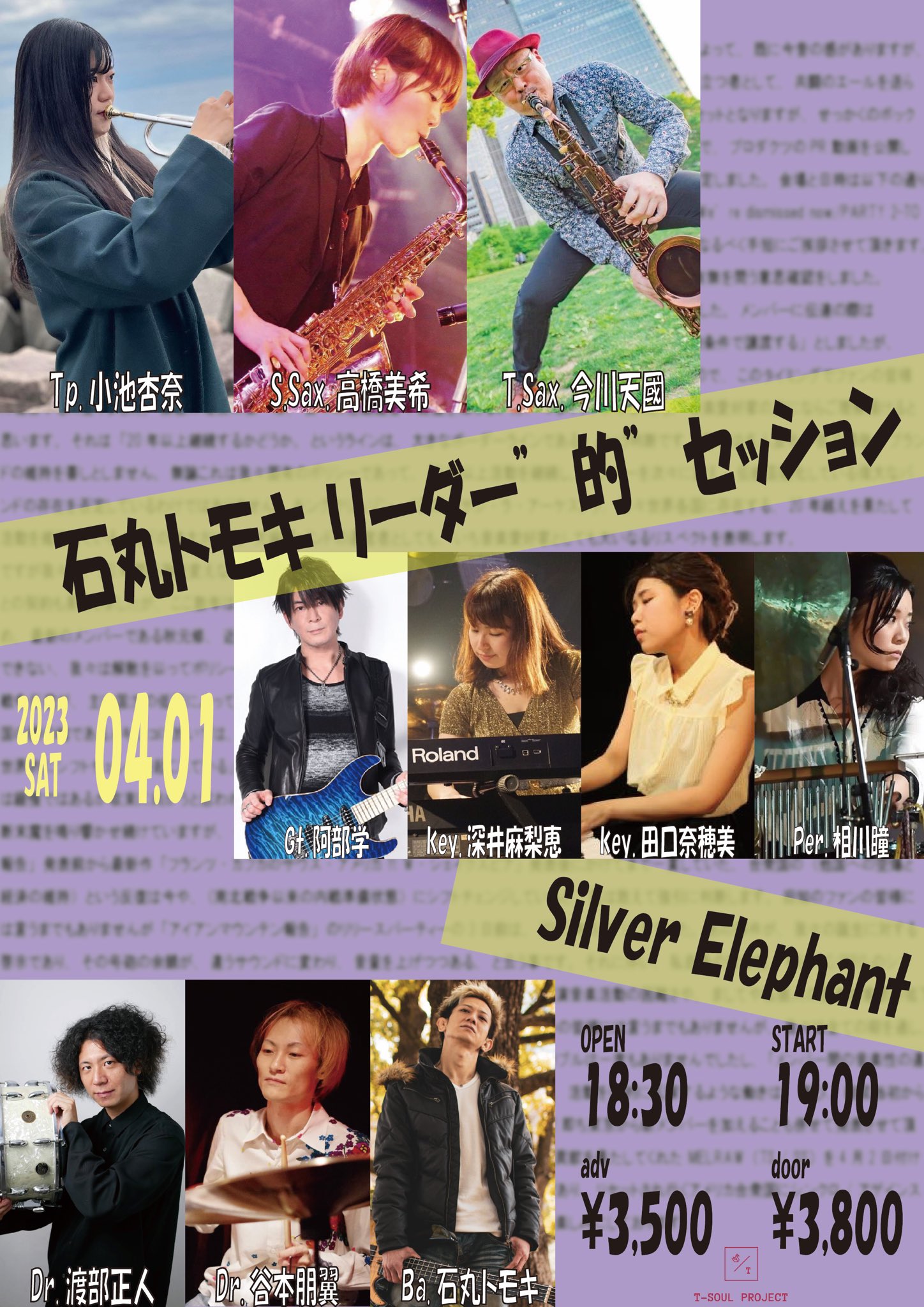 :石丸トモキ(b)・小池杏奈(tp)・高橋美希(sax)・深井麻梨恵(key)・谷本朋翼(d)